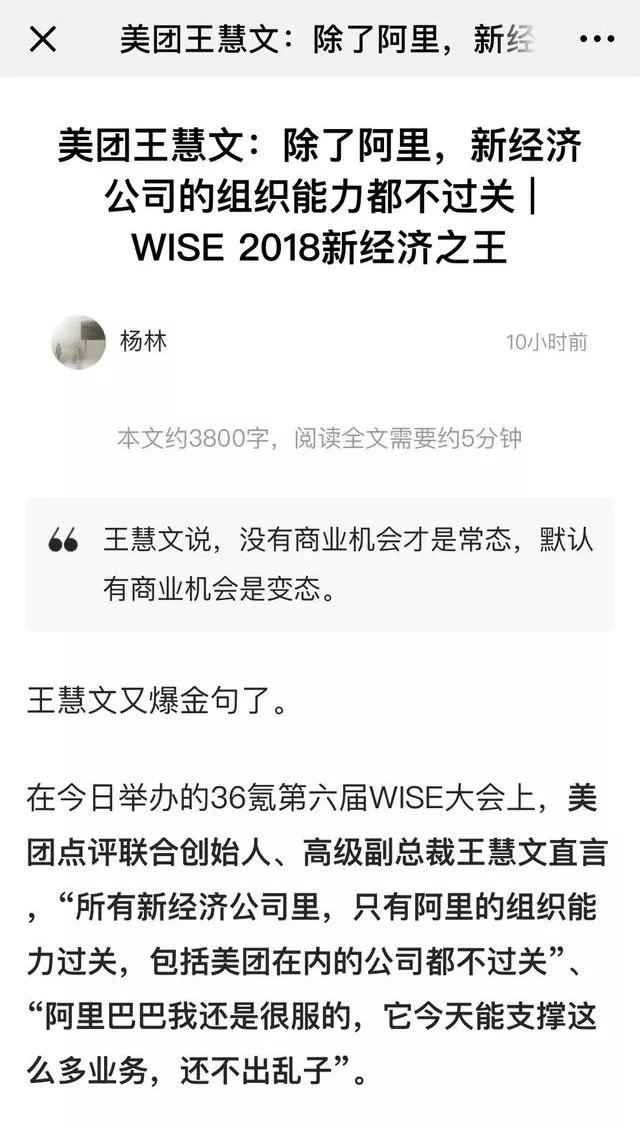 然而那一波热潮还没过去,王慧文马上又接受了36氪的又一次专访,在这次专访中王慧文话锋一转,再次口爆金句:除了阿里,新经济公司的组织能力都不过关。