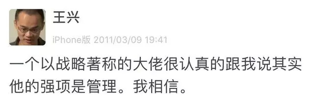 在很多人的眼中,对马云的印象应该都是和王兴一样的,觉得他是一名战略和忽悠的大师。所以很明显当时王兴对于马云的说法并不认可,一个以战略著称的大佬说他擅长管理?就像是在开玩笑,王兴甚至还公开对此表示了一波嘲讽。