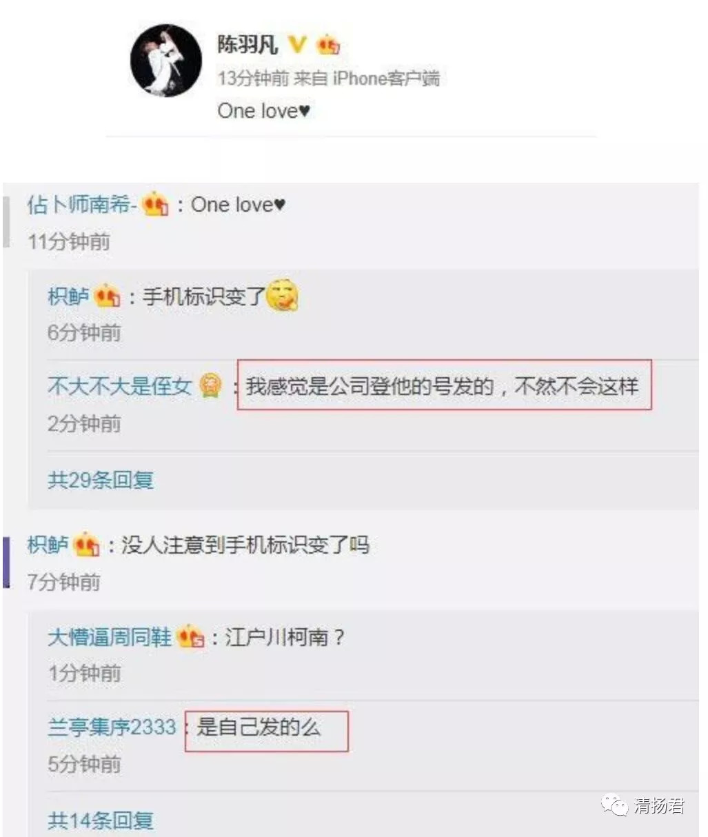 几乎同时,陈羽凡个人微博发出“one love”的内容,用来证明人没事。由于陈羽凡微博的手机标识从iPhone 7 Plus变成iPhone 客户端,被网友发现,怀疑是公司人员所为。