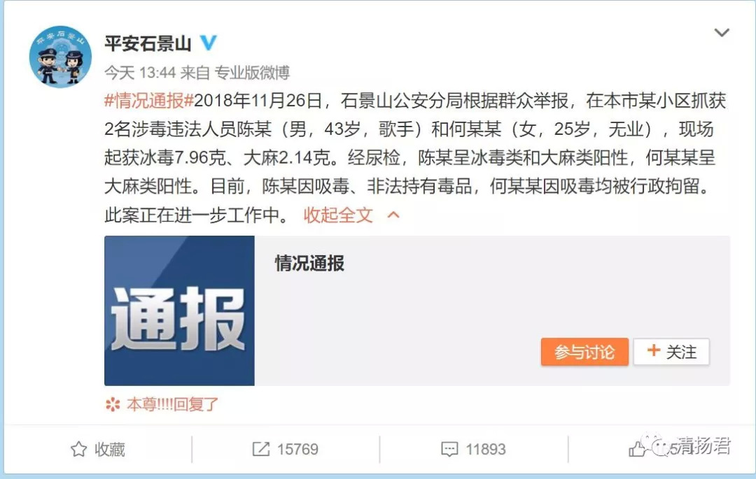 北京市公安局石景山分局官方微博“平安石景山”发布“情况通报”的微博,称“2018年11月26日,石景山公安分局根据群众举报,在本市某小区抓获2名涉毒违法人员陈某(男,43岁,歌手)和何某某(女,25岁,无业),现场起获冰毒7.96克、大麻2.14克。经尿检,陈某呈冰毒类和大麻类阳性,何某某呈大麻类阳性。目前,陈某因吸毒、非法持有毒品,何某某因吸毒均被行政拘留。此案正在进一步工作中。”