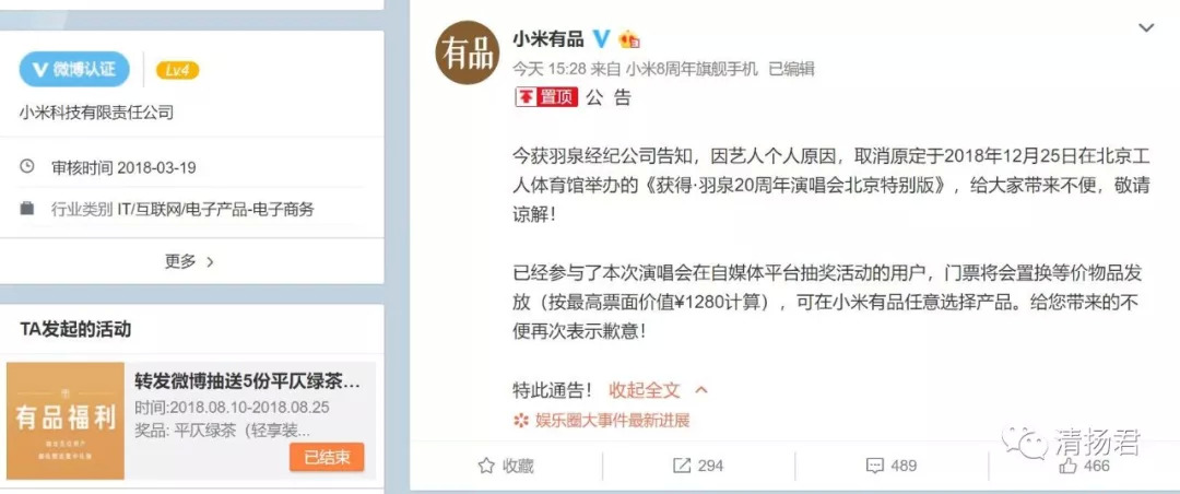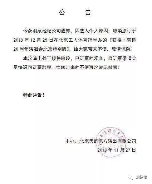独家冠名《获得·羽泉20周年演唱会北京特别版》的小米有品也宣布,因艺人原因,取消《演唱会》。已经参与了本次演唱会在自媒体平台抽奖活动的用户,门票将会置换等价物品发放(按最高票面价值¥1280计算),可在小米有品任意选择产品。