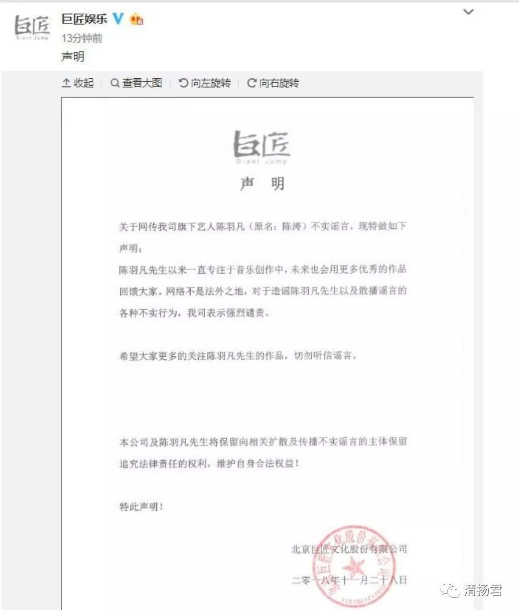 《声明》称,“陈羽凡先生一直以来专注于音乐创作中,未来也会用更多优秀的作品回馈大家。对于造谣陈先生以及散播谣言的各种不实行为,我司表示强烈谴责,并保留追究法律责任的权利。”
