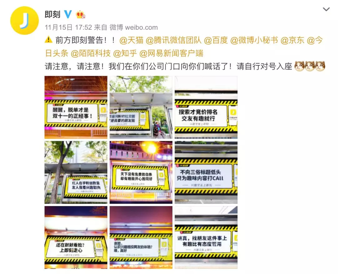 每篇文案都符合企业特色,比如喊话天猫,就是「醒醒,脱单才是双十一的正经事」;喊话微信,就是「都是同好的社交圈,才是我要的朋友圈」;喊话百度,就是「搜索才竞价排名,交友有趣就行」……类似这种,有七八上十张,最终落脚到「同好交友」上。