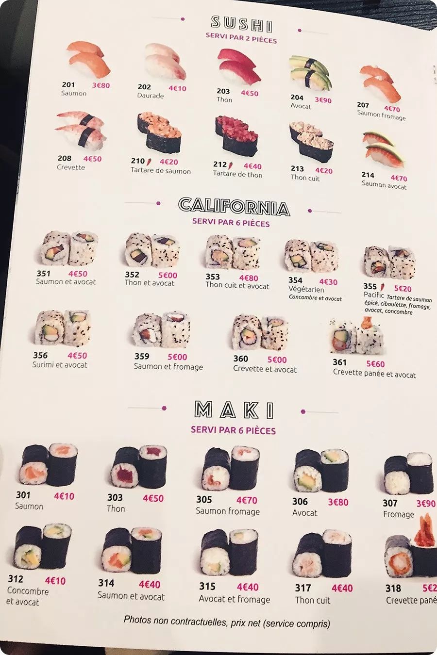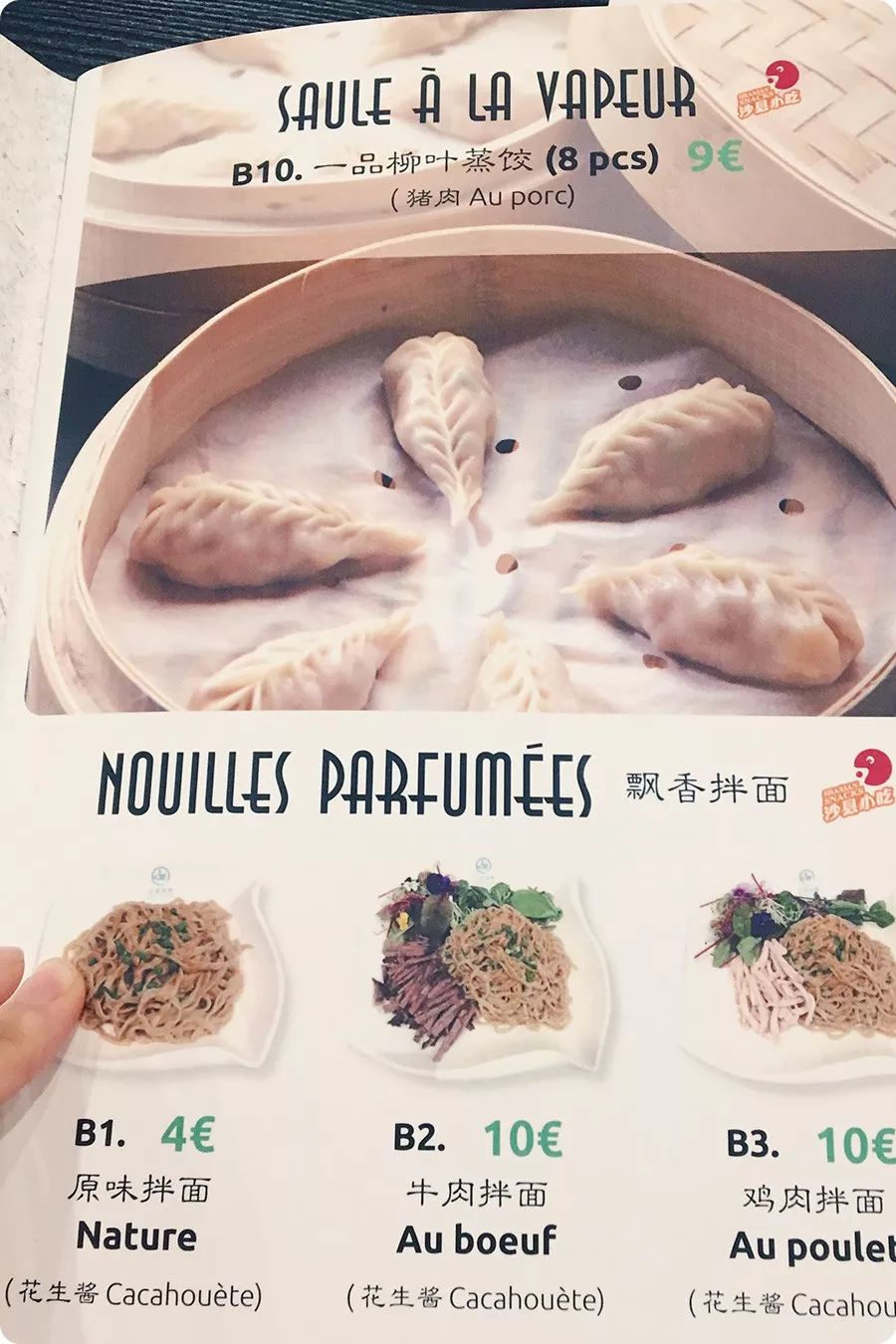 法国人的吃饭习惯,一定要有前餐,主盘还有甜点。果然,所有立足于这片土地的餐厅都无一例外。在这边的沙县菜单上,除了传统的拌面蒸饺之外,还能找到更违和的寿司和冰激凌。