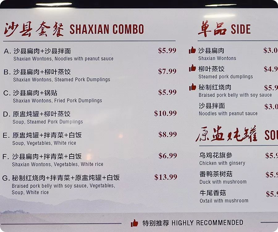 在这里沙县小吃已经更名为了沙县食鲜,从菜单排版看,已经脱离了国内的土味排版,一下子变得洋气起来。
