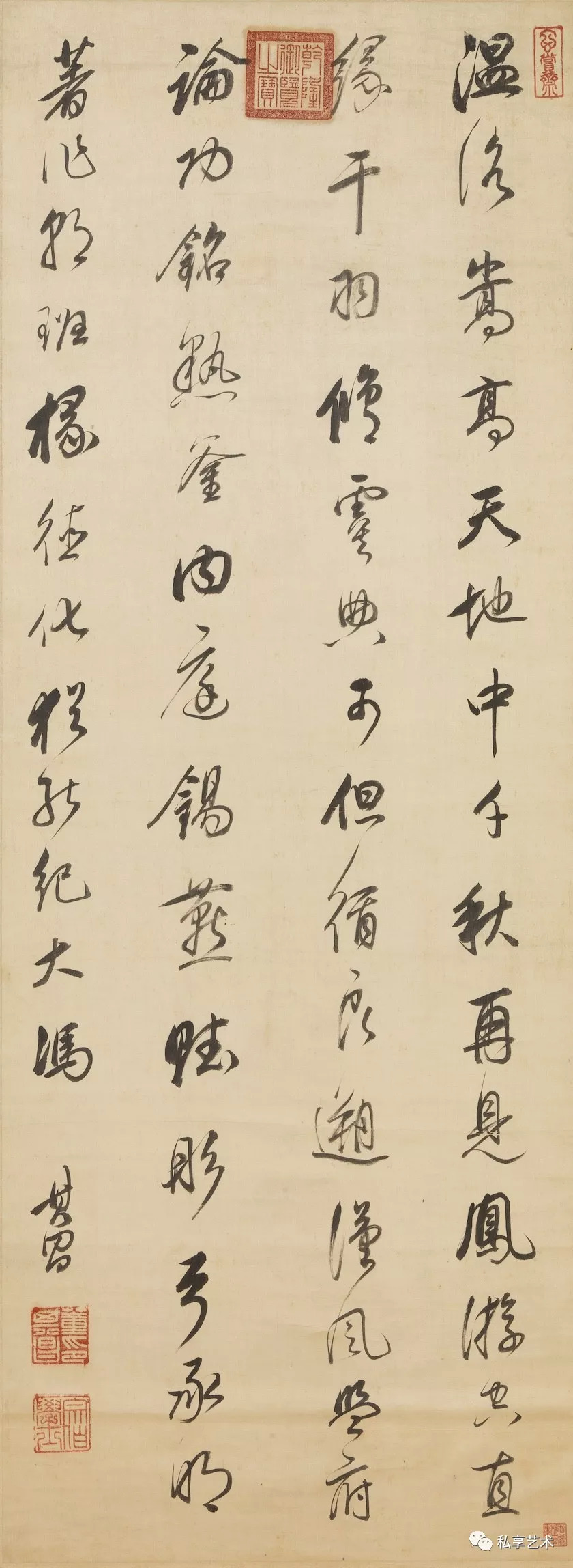 董其昌对五代杨凝式的书法极其推崇,杨凝式《韭花帖》萧疏散淡的书风自然对董其昌的书法创作有一定的影响。董其昌的书法布白疏朗,结体灵活,用笔则轻巧平滑,这些都体现了其「平淡天真」的书风。「平淡天真」还体现在他对用墨的讲究上,以淡墨作书,可以说是董其昌的一种创造,在董其昌之前极少见到书家运用。晚于董其昌的书家王铎创造了涨墨法,利用墨的干湿来表现胸中的激情,但在墨的浓淡方面似无明显之变化。董其昌巧用淡墨,作品墨气淋漓,呈现出清秀淡雅的面貌,烟火之气顿消,恬适之韵顿长,从而使观者得到了清新脱俗的艺术享受。