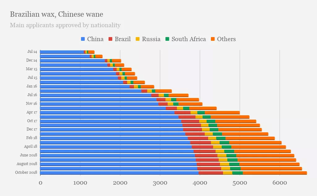 数据显示,截止2018年10月,葡萄牙黄金居留签证申请人获批总数达6562位,副申请人获批总数11125个。