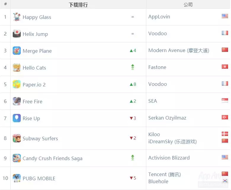 全球iOS+Google Play游戏下载榜,《Merge Plane》第三名,《PUBG Mobile》则掉到第10