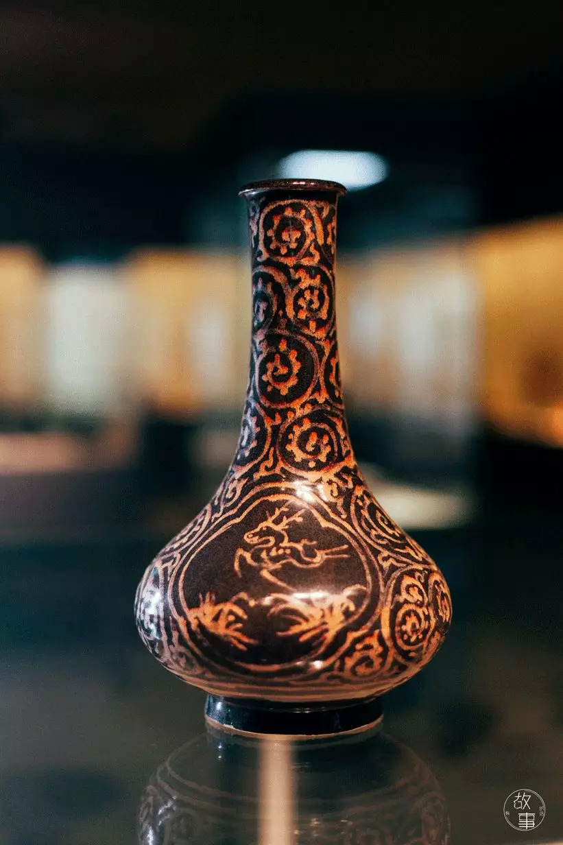 ▲元 吉州窑黑地褐彩开光莲池鸳鸯纹长颈瓶