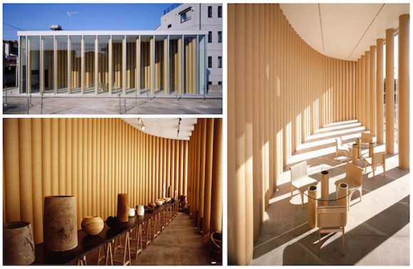 以圆弧状排列的纸筒营造出具有动态感的明亮空间。