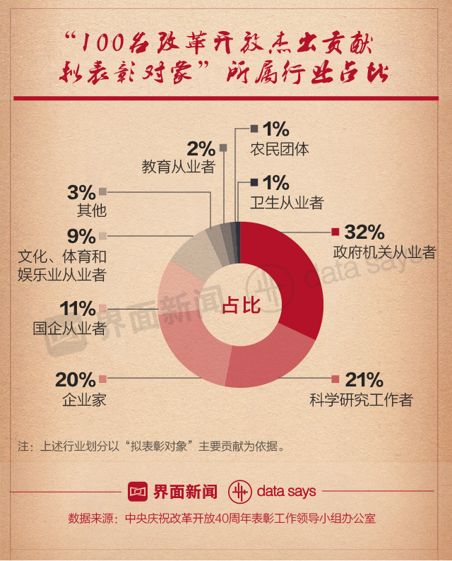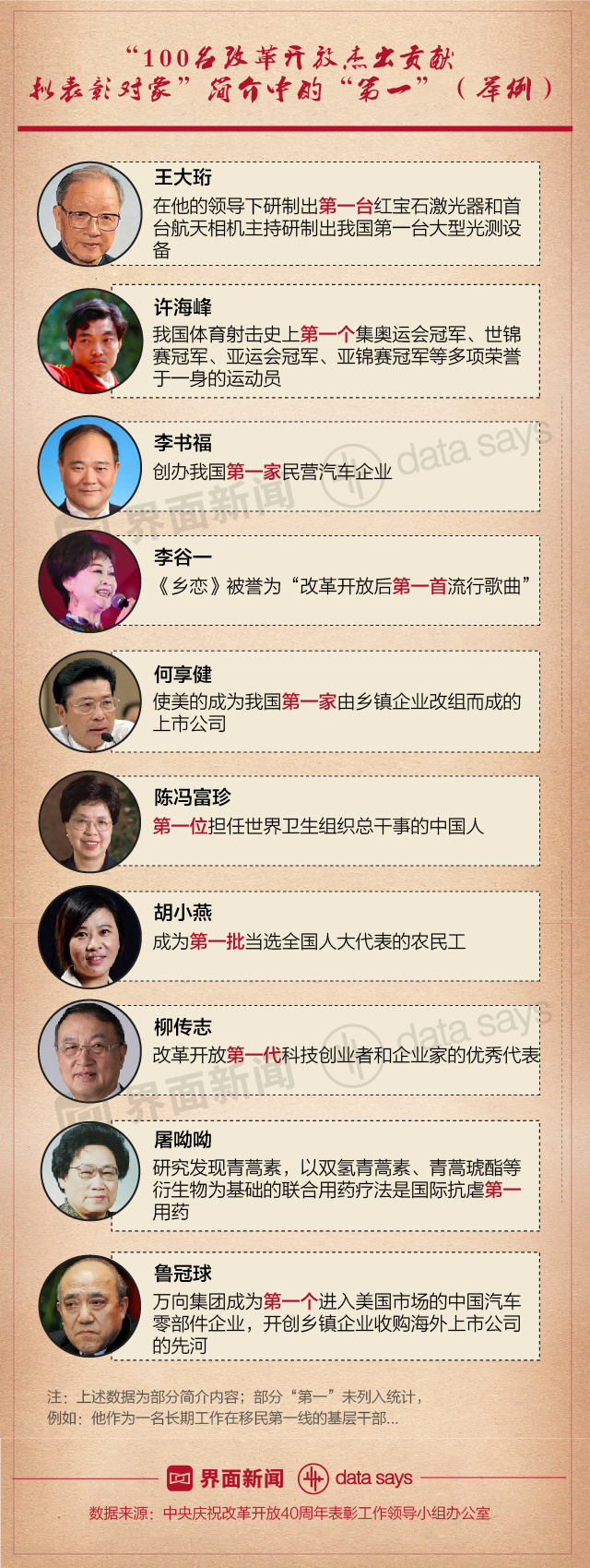 近日,中央庆祝改革开放40周年表彰工作领导小组办公室刊登出《关于改革开放杰出贡献拟表彰对象的公示》,其中包含100名改革开放杰出贡献拟表彰对象(以下简称“拟表彰对象”)及其简介。