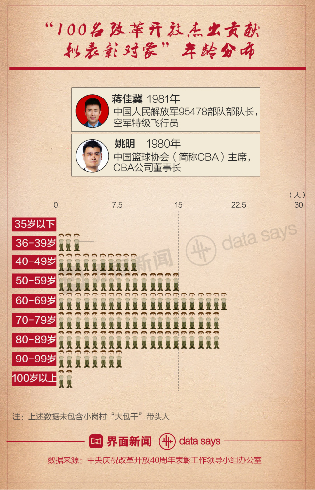 据界面数据(公众号ID:tuli_shuju)统计,六成以上“拟表彰对象”在60岁至89岁之间。同时,最年轻的2名为“80后”蒋佳冀(空军特级飞行员)和姚明(中国篮球协会主席)。