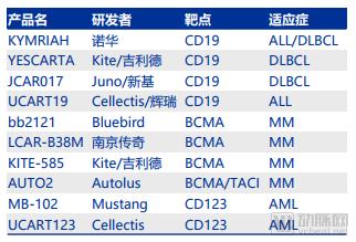 目前已有两款CAR-T上市,分别是诺华的KYMRIAH(适应症为末线25岁患者的急性淋巴性白血病ALL和末线DLBCL)和Kite的YESCARTA(适应症为末线弥漫大B细胞淋巴瘤DLBCL)。除此之外,还有诸多针对不同靶点的CAR-T疗法处于临床试验中,较为著名的有Juno/新基的JCAR017、Cellectis/辉瑞的UCART19、蓝鸟的bb2121、金斯瑞旗下南京传奇的LCAR-B38M等。