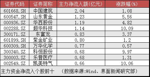 剔除尚未开板的新股,全天主力净流入额超过1亿的个股有4只,分别是中国建筑(601668.SH)、山东黄金(600547.SH)、华西股份(000936.SZ)、超华科技(002288.SZ)。超华科技在主力资金抢筹后涨停。化工股备受主力追捧,华西股份、万华化学(600309.SH)、科恒股份(300340.SZ)等分别实现主力净流入1.19亿元、0.77亿元、0.68亿元。