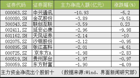 全天,主力资金净流出额超过1亿的个股有25只。受累于通信板块的整体式微,中兴通讯(000063.SZ)以10.93亿元的主力净流出额位居两市第一。提议高送转方案的联创互联(300343.SZ)涨停后开板,全天主力净流出3.59亿元。券商股午后杀跌惨重,天风证券(601162.SH)、东方财富(300059.SZ)分别有2.14亿元、1.90亿元的主力净流出。
