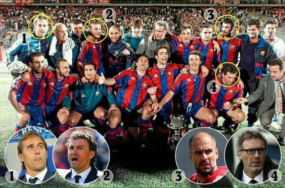 值得一提的是,由巴萨主帅恩里克、切尔西主帅穆里尼奥、拜仁慕尼黑主帅瓜迪奥拉、巴黎圣日耳曼主帅布兰科、波尔图主帅洛佩特吉以及埃因霍温主帅科库组成的“巴萨教练团”,本赛季甚至有望创造在西甲、英超、德甲、法甲、葡超和荷甲——欧洲六大联赛同时获得冠军的伟业。而这六位教练均来自于巴萨在1996-1997赛季夺取西班牙超级杯的主力阵容。当然,彼时的穆里尼奥还只是巴萨主帅范加尔身边的助教兼翻译官。