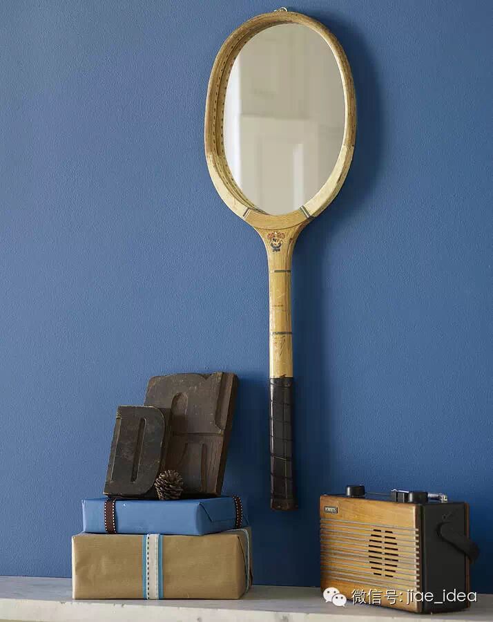 旧的球拍,往往因为断了线便被弃置一旁。可是将线一一拆下,安上一面明亮的镜子,再将它悬挂起来。你就得到了一面足够特别的镜子。