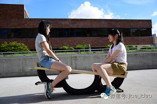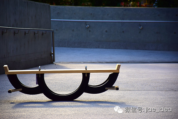 用旧轮胎做的跷跷板——三段轮胎构成跷跷板的支点和两端的落地点,轮胎可以耐磨、减震,让落地更平稳。