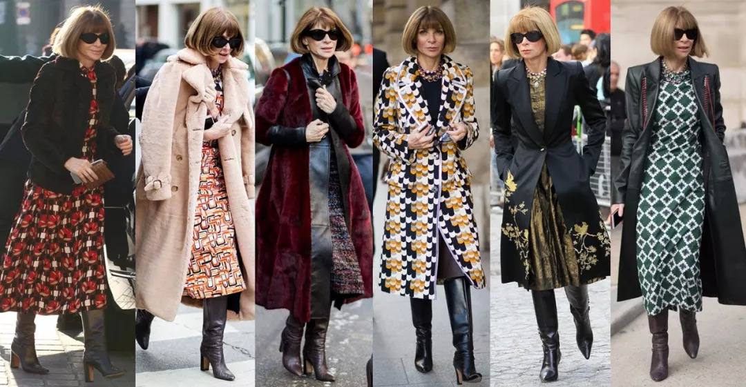 女魔头怕是全天下最爱用中长裙搭配过膝靴的女人且没有之一了。她的冬天永远都是这么度过的。