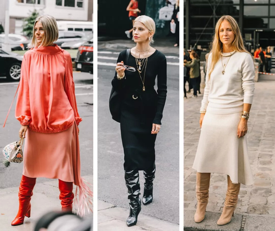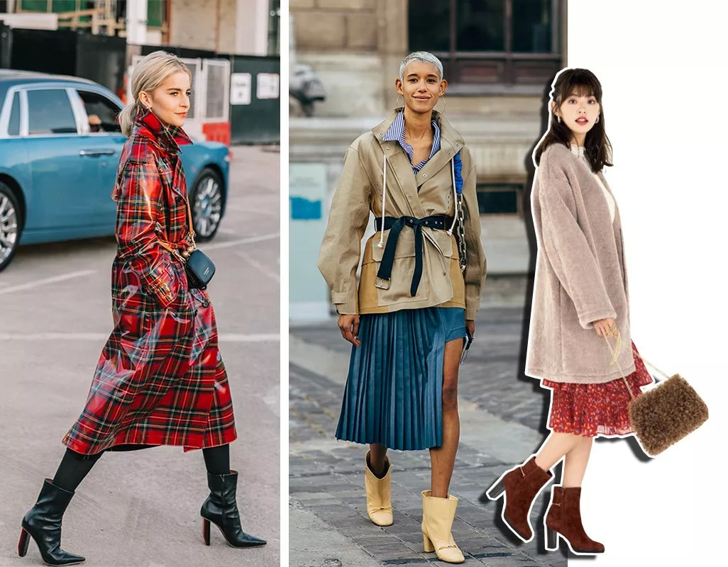 另外还有一个小tips,当你的裙子长度较长,且材质也比较厚实的时候,靴子还是应该选择更收脚踝的款式。