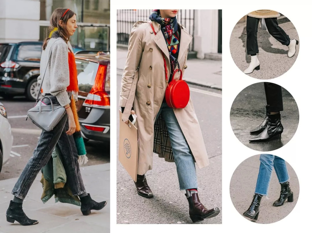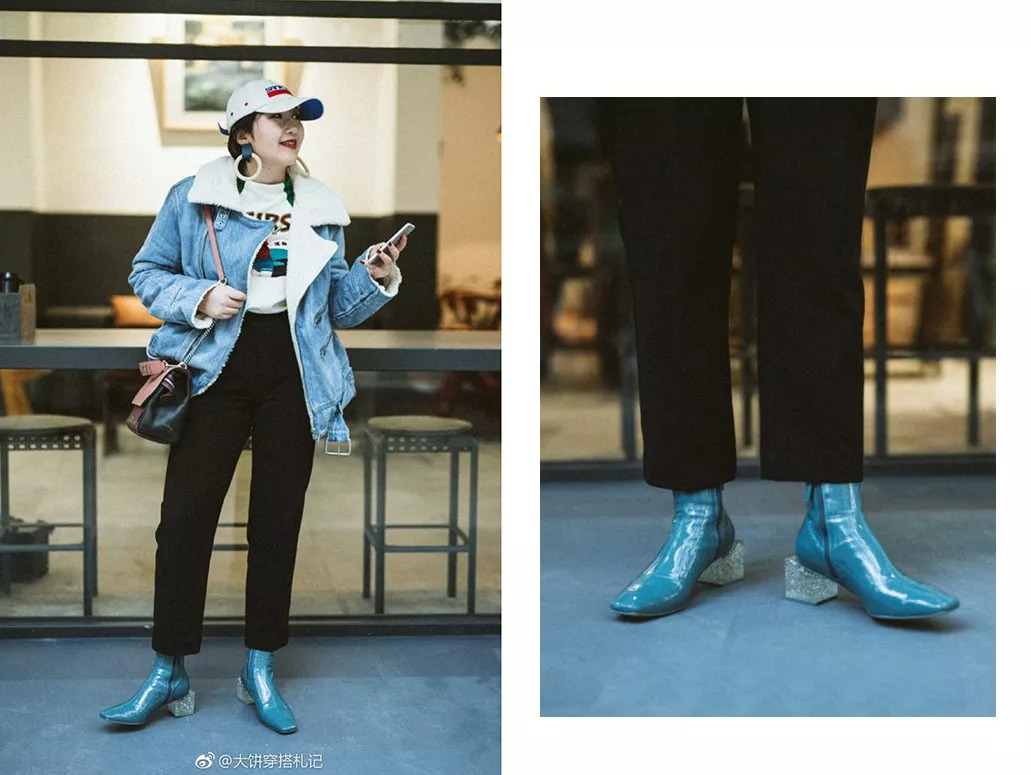 包括本饼的小脚烟管裤,也是用窄口踝靴去搭配才更显瘦。
