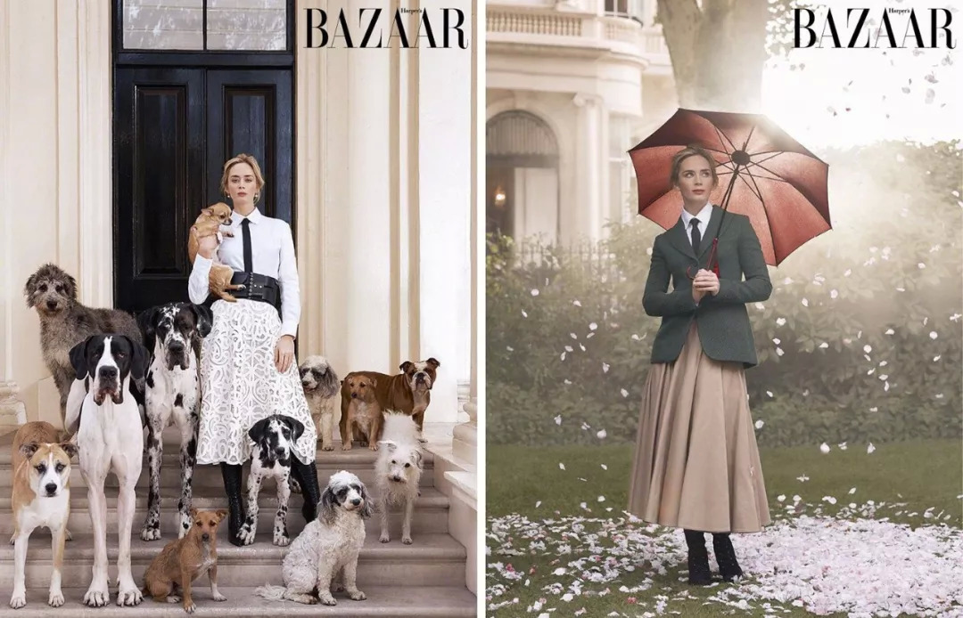 不仅女魔头本人,电影《穿Prada的女魔头》中Emily的扮演者Emily Blunt,在英版《BAZAAR》中也有贡献过长裙+长靴的look,满屏好看的英伦腔!