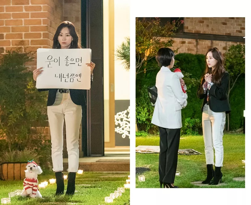 韩剧《内在美》中,韩世界小姐姐也是用小脚口的铅笔裤来搭配高跟袜靴,显得脚踝超修长的!!