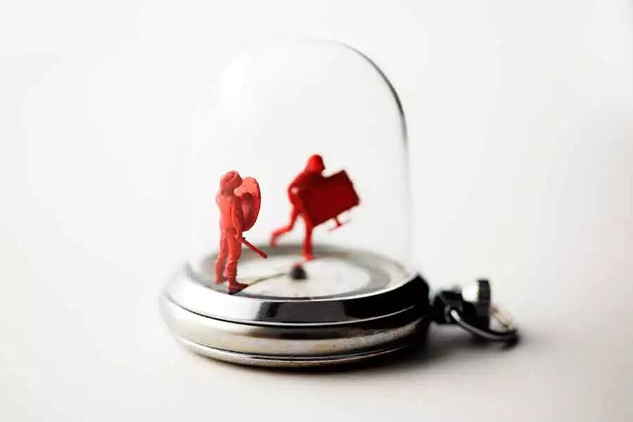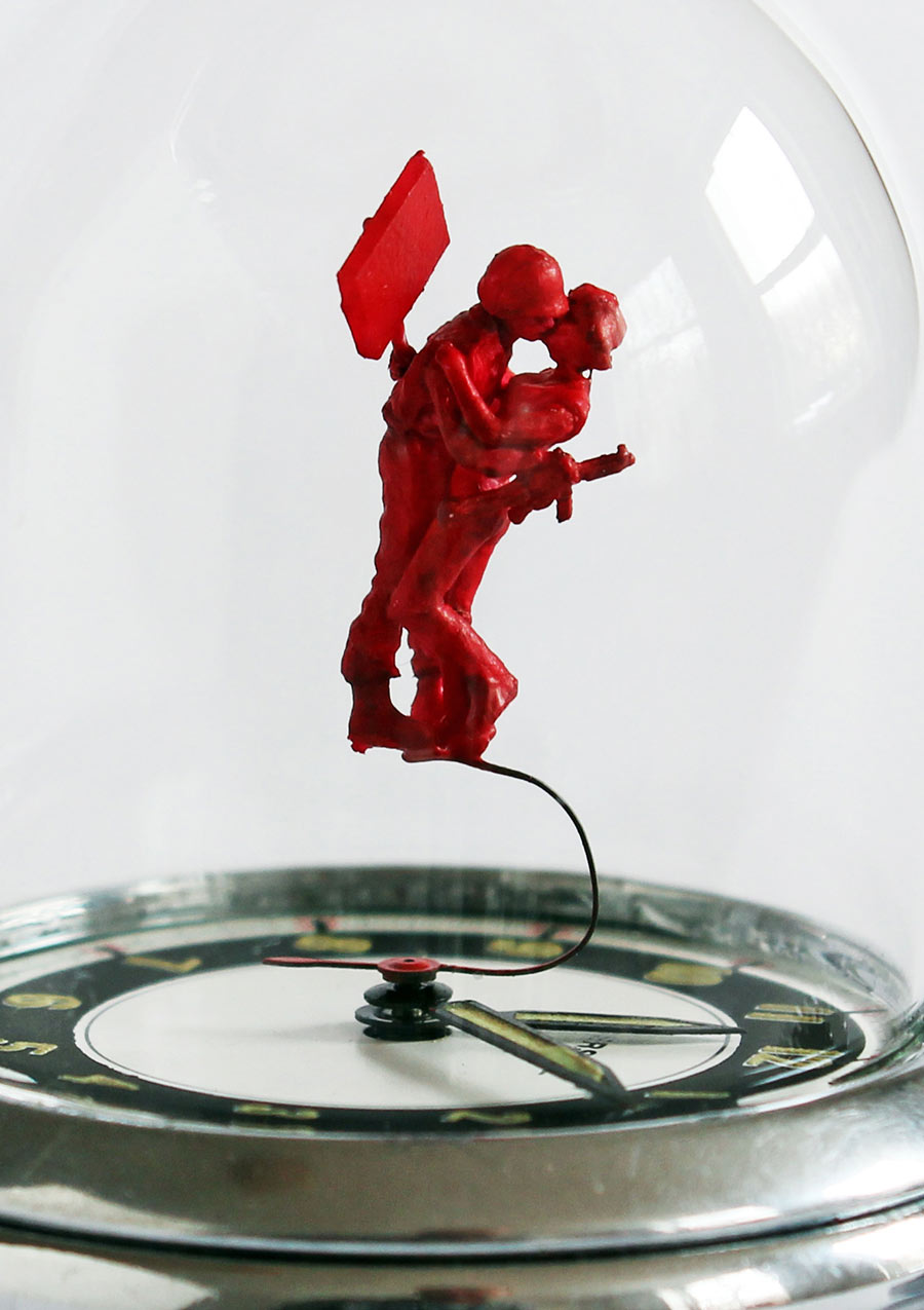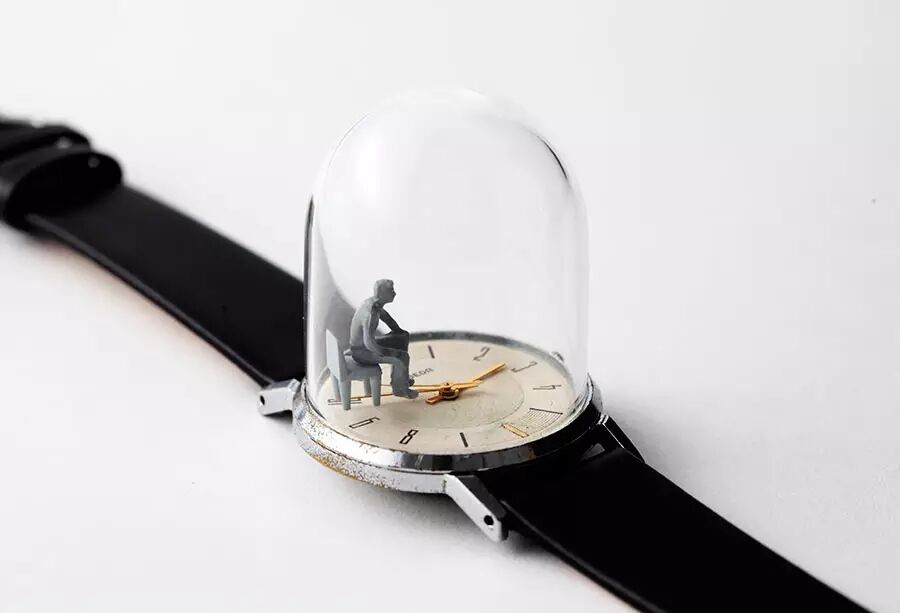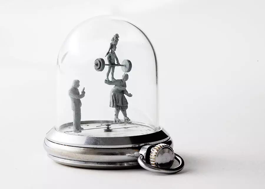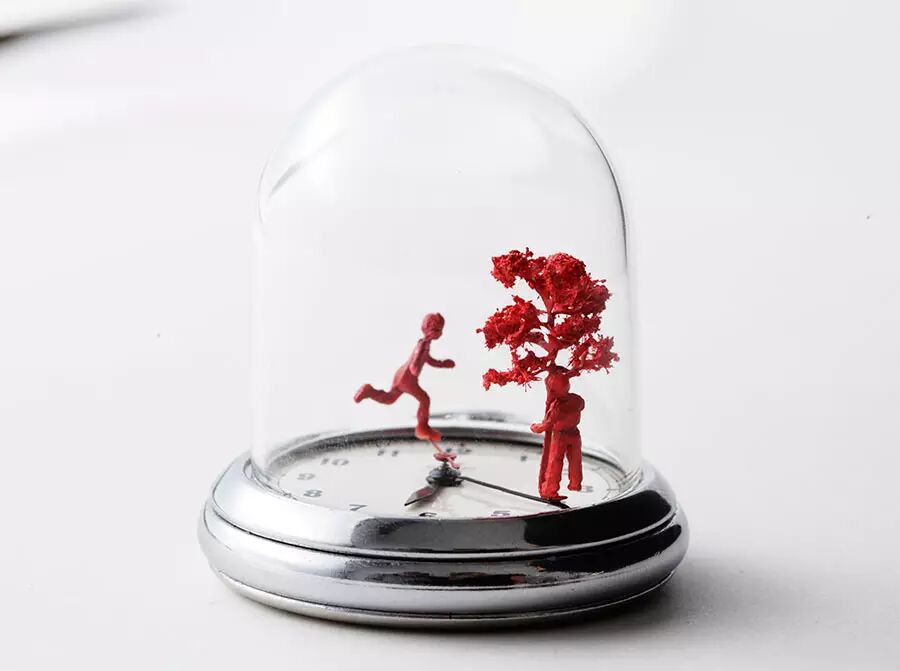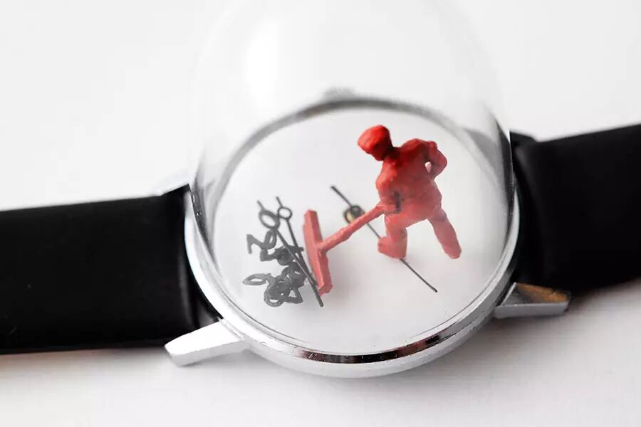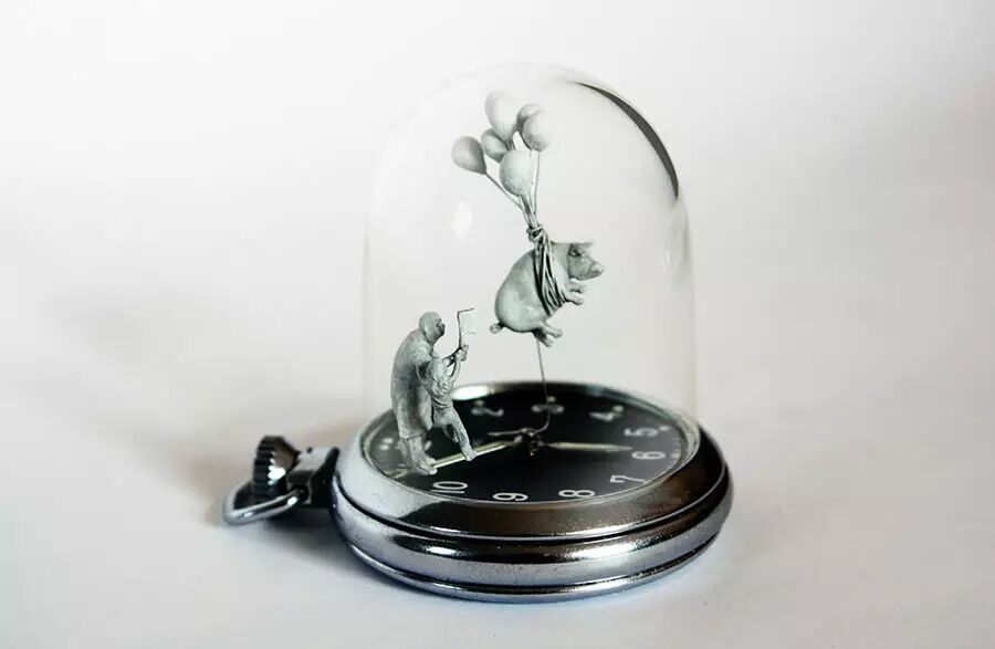 Dominic Wilcox用旧机械手表与人物模型,制造了“Moments in Time”系列微型手表雕塑。每只手表都凝固了一个瞬间,好似时间便在此停顿。