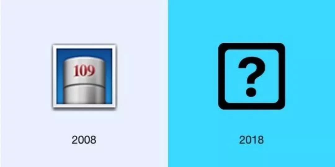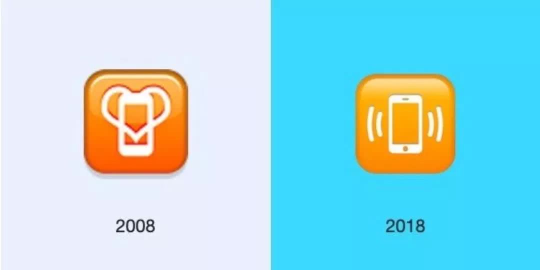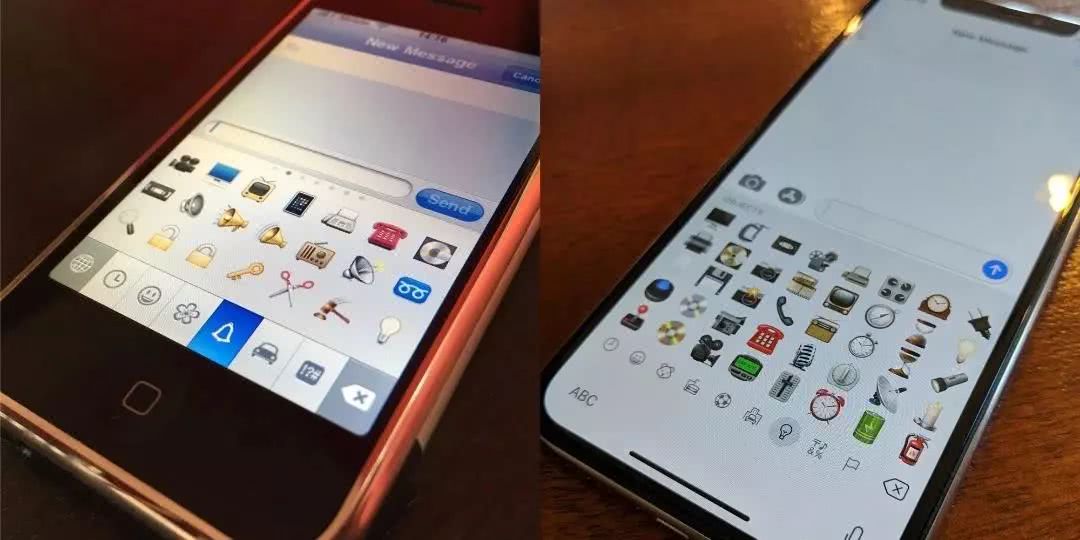 * 2008年苹果的emoji输入法(左)和2018年的emoji输入法(右)
