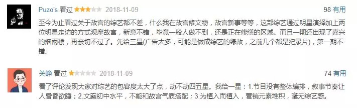 但对于这种形式融入综艺节目,观众褒贬不一。这样一个太“接地气”的综艺让一些观众觉得故宫不再阳春白雪,染上了些许“铜钱味”。
