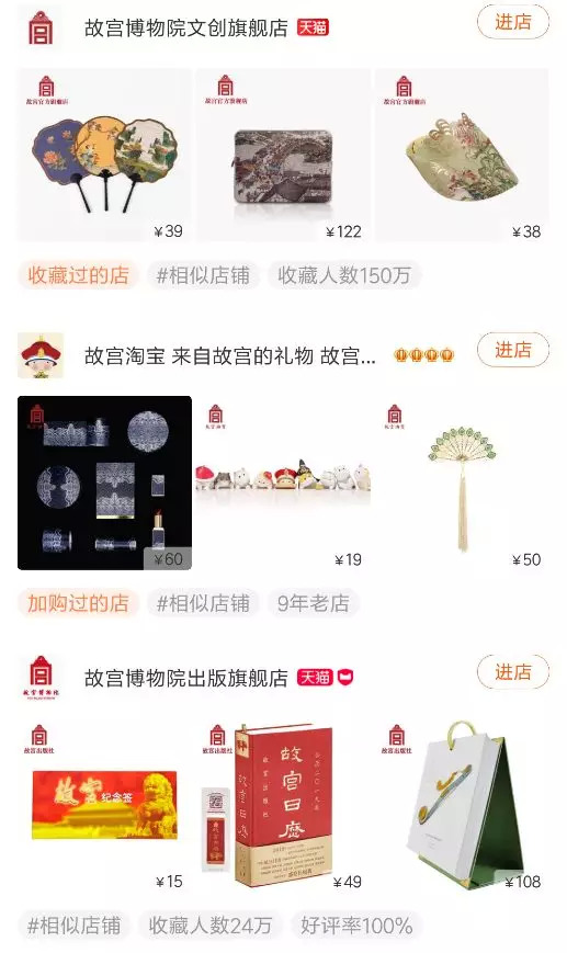 淘宝上,故宫博物院相关的官方店铺就有3家:售卖文化创意生活用品的故宫博物院文创旗舰店、主打萌系路线并助推故宫成为“网红”的故宫淘宝以及出售书籍字画的故宫博物院出版旗舰店。