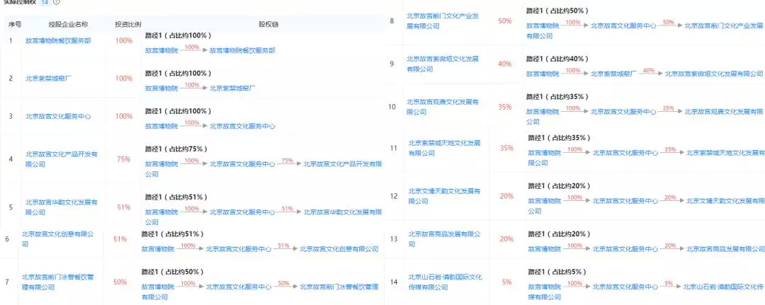 北京故宫博物院拥有实际控制权公司共14家,其中北京故宫文化服务中心对外投资了10家企业,是故宫博物院的实际运营主体,多数都是关于文创类产品公司。