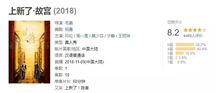 目前这一档真人秀节目已在豆瓣收获了8.2分的评分。这个成绩对大多数综艺节目来说算是相当出色了,但对比之前的故宫相关节目却有差距。