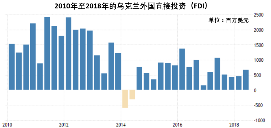 由于政局的不稳定以及无法根除的腐败,乌克兰的外国直接投资(FDI)在广场革命后出现了持续下滑。