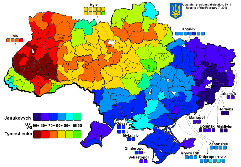 乌克兰的政治分化在2010年大选时体现得尤为明显,图中蓝色选区代表亚努科维奇占优,红色选区代表季莫申科占优,绿色代表双方得票数不分上下。在乌克兰西部和东部都出现了单一政党占据绝对优势的现象,中立的摇摆省屈指可数。