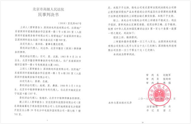 11月30日下午消息,共享充电宝企业来电科技起诉街电科技专利侵权一案近日作出终审判决。北京市高级人民法院终审判决维持原判:被告街电科技停止侵权行为,于判决生效之日起立即停止制造涉案Anker设计12口产品;并赔偿原告来电科技经济损失共计200万元;判决被告街电公司于本判决生效之日起三十日内停止使用涉案Anker设计12口产品。