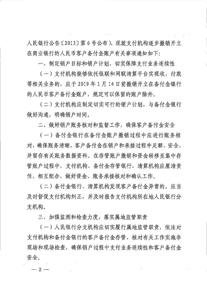 11月29日,央行支付结算司向各中支机构、各备付金银行网络金融部和支付机构下发《中国人民银行支付结算司关于支付机构撤销人民币客户备付金账户有关工作的通知》(银支付【2018】238号)(下文简称“文件”)。