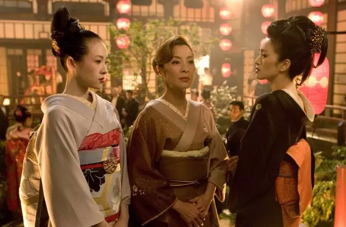 《艺妓回忆录》接踵而来,但是在这部电影里,杨紫琼的角色本身没有巩俐和章子怡的角色发挥空间大,可要说最有“艺伎”气质神韵的,还是她演的真美羽,她甚至学会了弹三味线。
