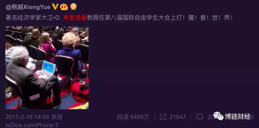 诺贝尔经济学奖得主米尔顿·弗里德曼的儿子大卫·D. 弗里德曼也是一位著名经济学家,他是我朋友,我发过他玩《魔兽世界》的照片,在微博上获得了6000万次阅读。实际上他还玩很多有意思的东西,比如写小说。