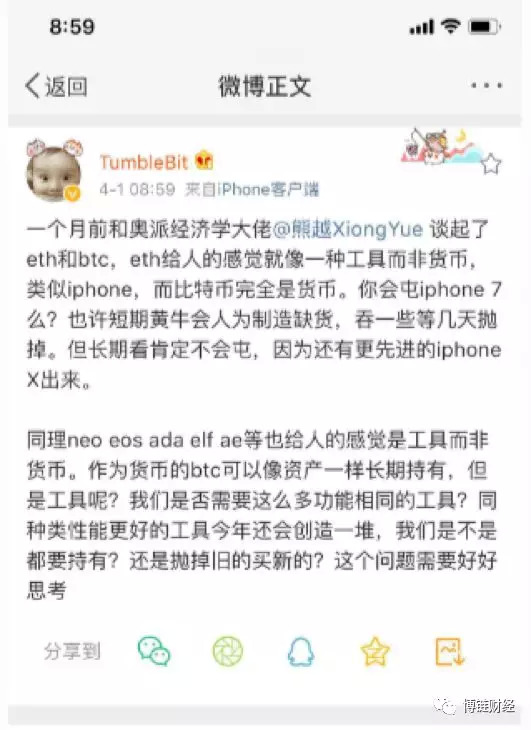 但这几个人都是天王级的布道者,包括微博上的货币之王比特币,长铗,比特币QQagent(吴忌寒),P2PBUCKS(我的同事四海),李笑来,都是观念非常超前的人。