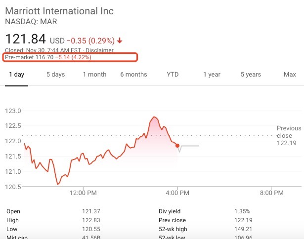 消息发出后,万豪股价在周五盘前下跌4.22%。