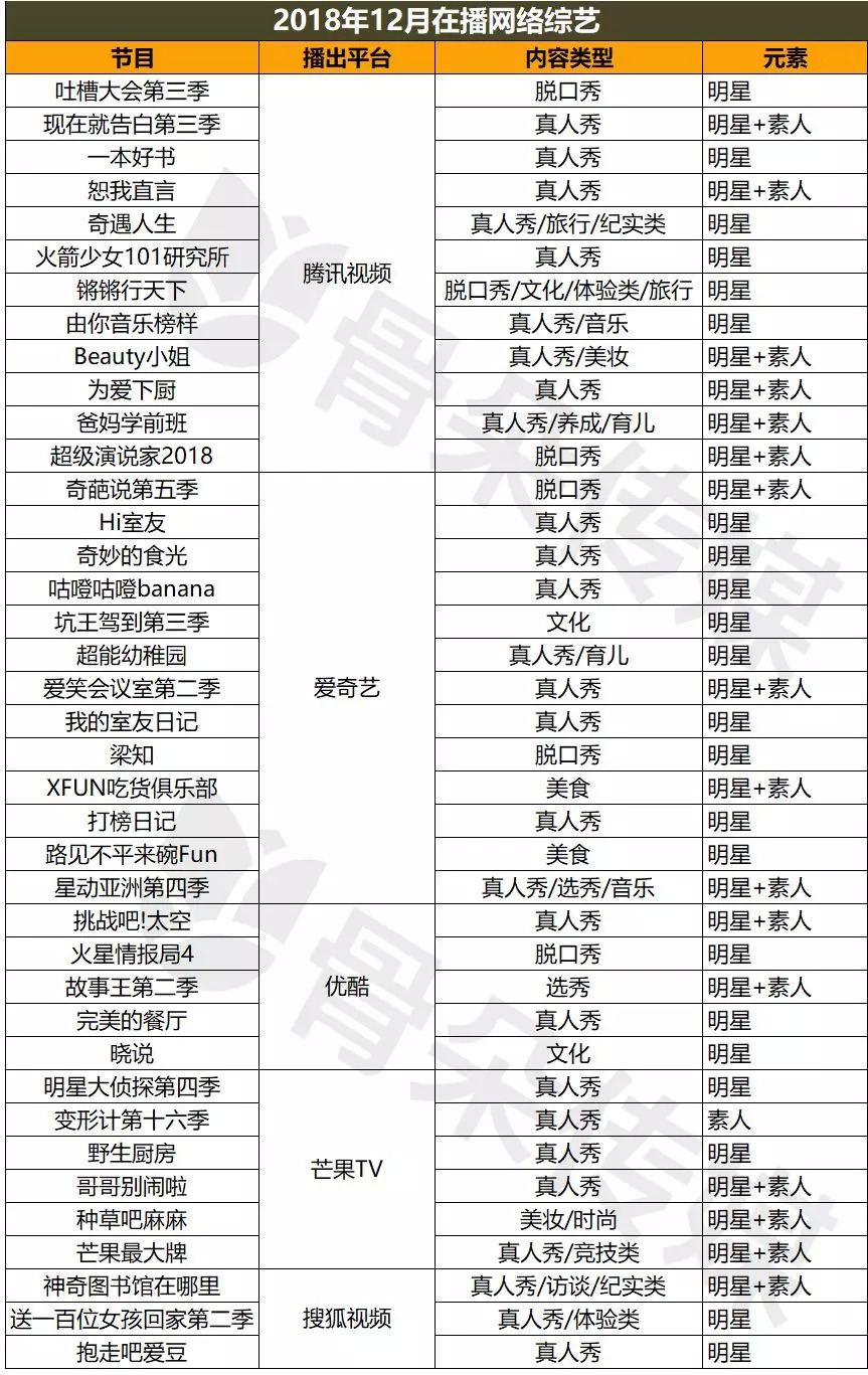 整个12月依然以选秀和真人秀为主,除了开播的两档选秀,今天播出的《国风美少年》也会加入12月选秀大军,39档在播节目和四档新开播节目,观众们可以好好跨个年了。