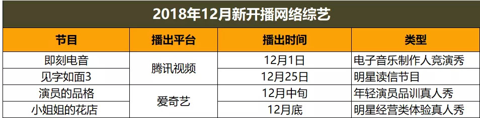 《这就是灌篮》收官后,《国风美少年》立刻上马,紧接着《即刻电音》和《演员的品格》将无缝对接。12月在播的选秀节目有三档,和暑期不相上下,而且都是大制作。同时,备受好评的《见字如面》会推出第三季,全明星真人秀《小姐姐的花店》也将在12月上线。