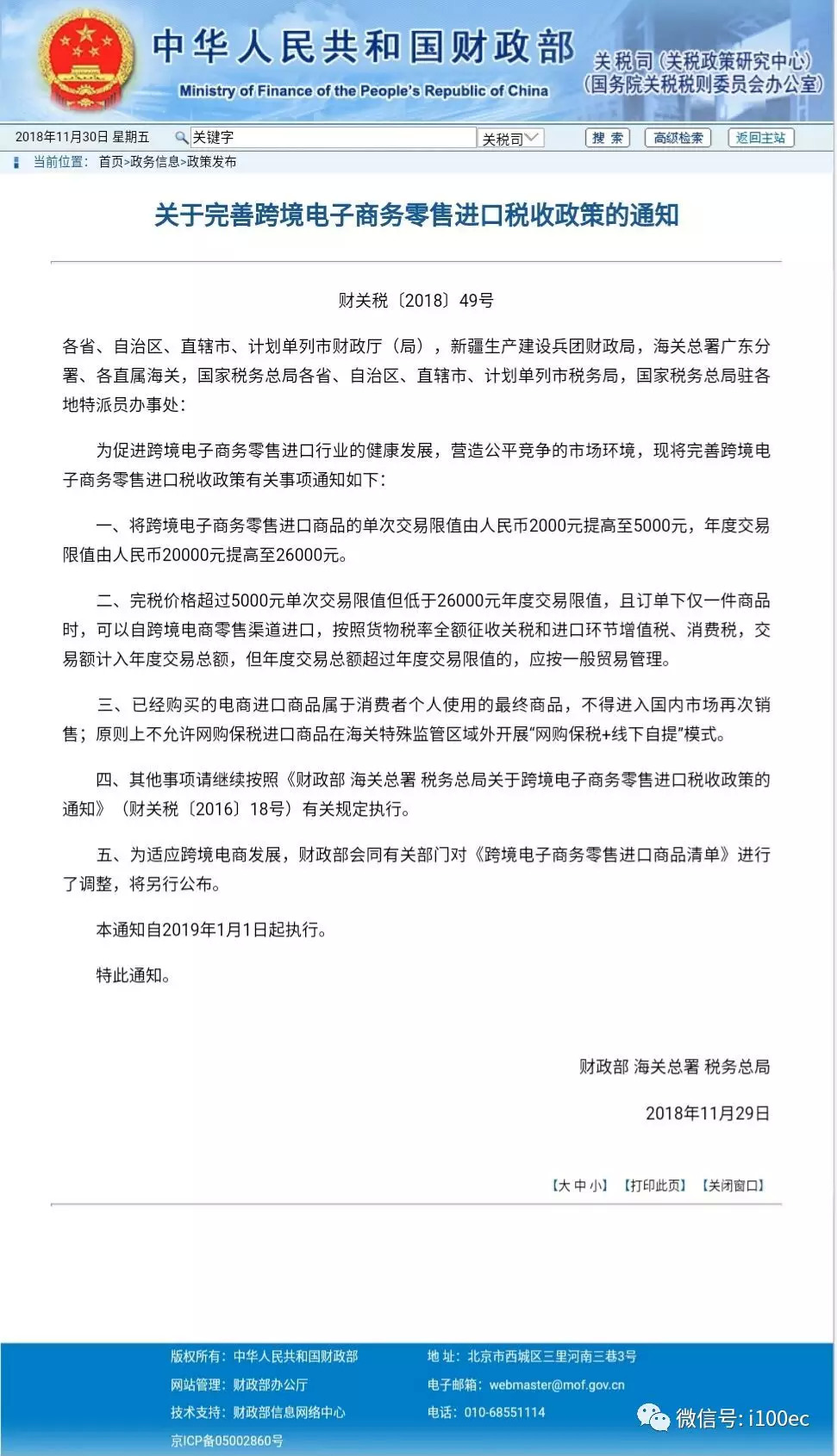 导读:11月30日,为做好跨境电商监管过渡期后政策衔接,商务部、财政部等十几个部委联合发布了三份进口跨境电商政策文件,进一步完善我国跨境电商零售进口监管工作,调整跨境电商零售进口税收政策,提高享受税收优惠政策的商品限额上限,扩大清单范围,并于2019年1月1日起执行。对此,长期关注电商行业发展的电子商务研究中心(微信ID:i100ec)第一时间发布【电商快评】给予分析解读。