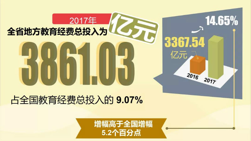 2017年,全省地方教育经费总投入为3861.03亿元,占全国教育经费总投入的9.07%,比上年的3367.54亿元增长14.65%,增幅高于全国增幅5.2个百分点。