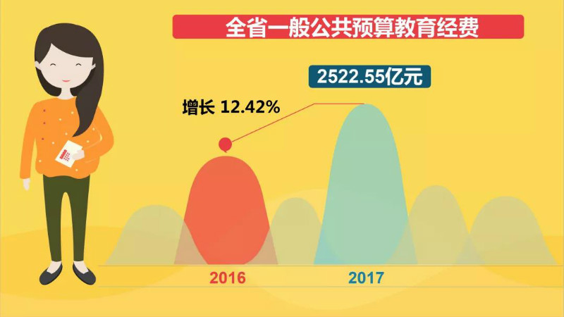 2017年,全省一般公共预算教育经费占一般公共预算支出15037.47亿元的比例为16.77%,比上年的16.69%提高了0.08个百分点,高于全国平均占比14.71%的 2.06个百分点,占比在全国排第13位。
