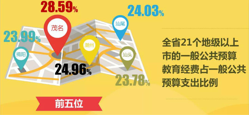 全省21个地级以上市的一般公共预算教育经费占一般公共预算支出比例,排在前五位的依次是:茂名市(28.59%)、潮州市(24.96%)、汕尾市(24.03%)、揭阳市(23.99%)、汕头市(23.78%);排在后五位的依次是:深圳市(10.13%)、中山市(14.32%)、珠海市(14.36%)、韶关市(16.81%)、阳江市(17.32%)。