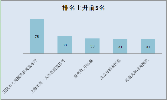 本周数据与上周相比,波动不大。相对稳定,是不是又一个“稳定期”的到来,就要看玉溪市人民医院新闻发布厅、北京和睦家医院、温州市中医院、上海市第一人民医院宣传处、河南大学淮河医院这五家坐上“火箭”上升的医院能否稳定发挥啦。