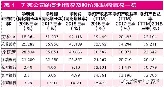 从2016年三季度~2018年三季度,恒瑞医药净利润同比增长率长期在21%以上,乐普医疗和片仔癀更是在25%以上,今年到了40%以上。这三家医药股如此,招商银行、光大银行、民生银行和万科也是如此。