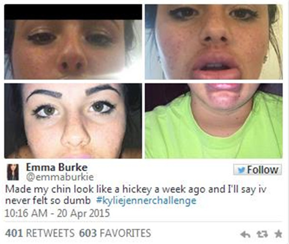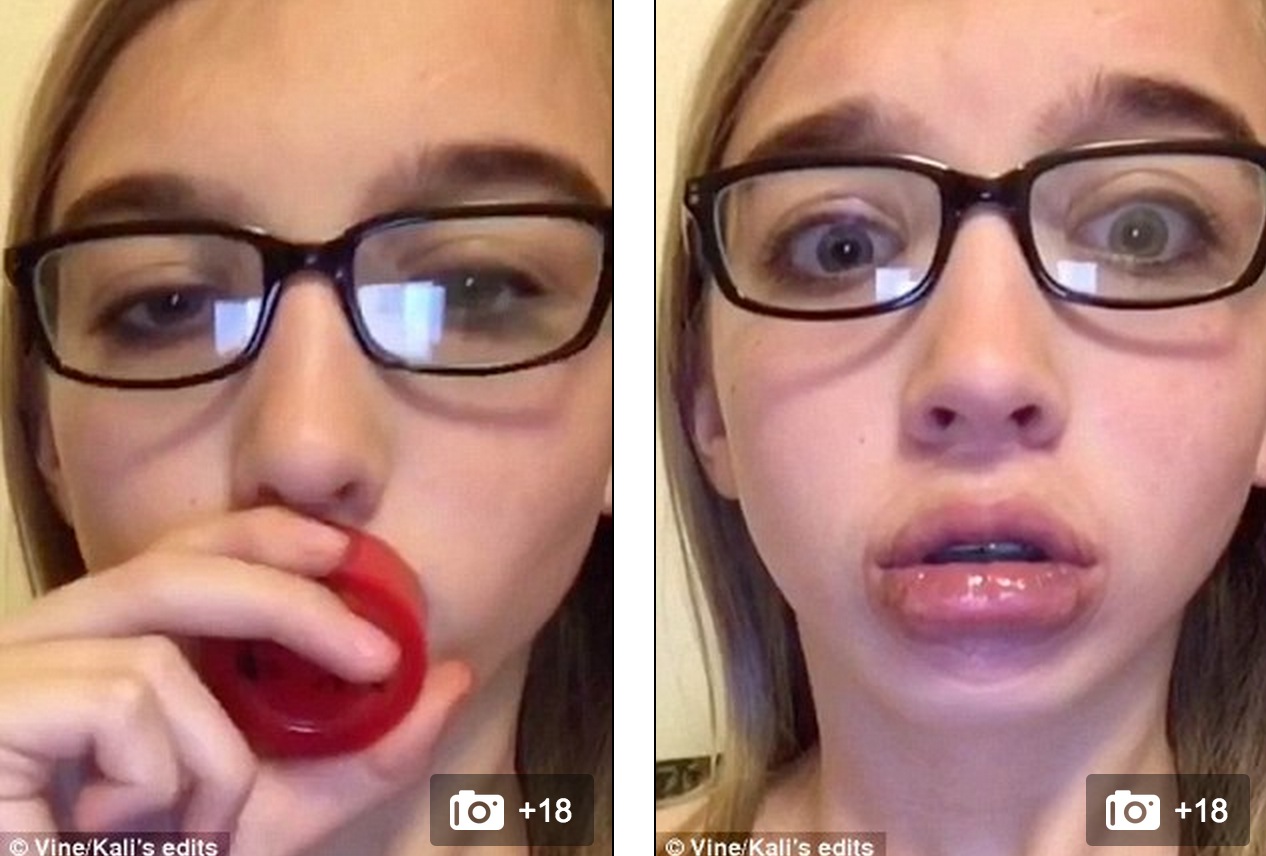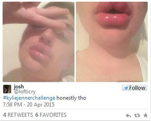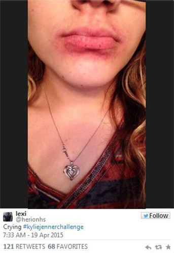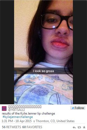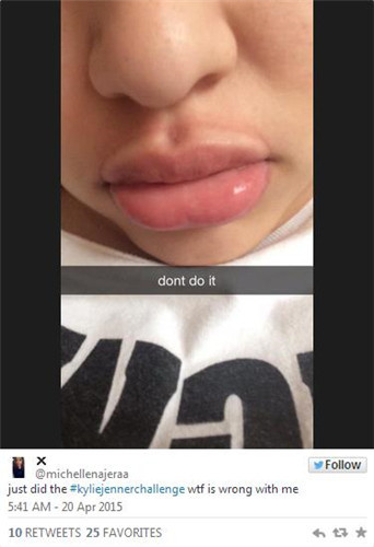 4月19日晚上,一个名为#KylieJenner挑战#的标签在各大社交平台上流行了起来,Kylie的粉丝们用随处可见的家居用品为自己来了一场Kylie Jenner嘴唇大改造。